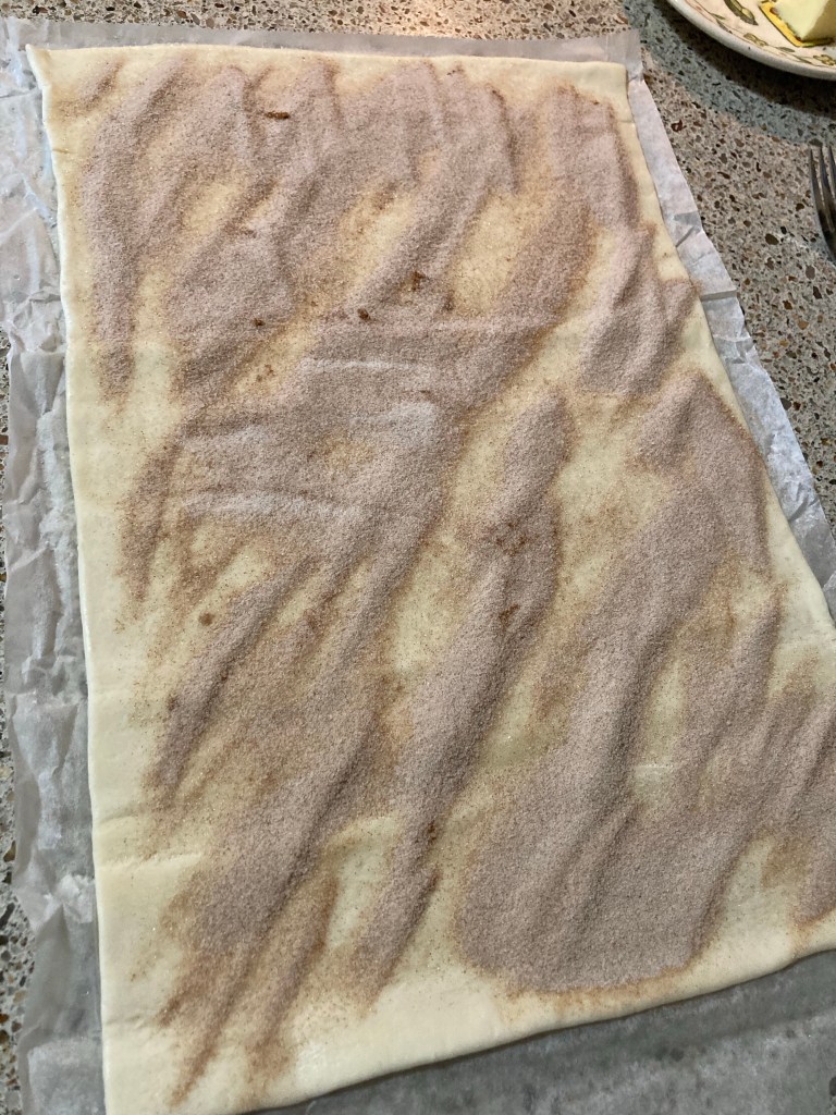 Unroll or roll out your puff pastry dough in a rectangle. If your dough is dry, brush with a bit of water. Then top the dough with a cinnamon and sugar mixture. I used 3 Tbsp of white sugar and 1 1/2 tsp cinnamon.