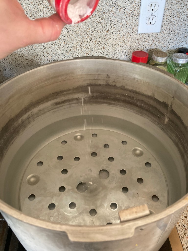 Fill your pressure canner with the required amount of water (typically around 3 qts). I always add cream of tartar about 1/4 tsp. Then start warming the water.