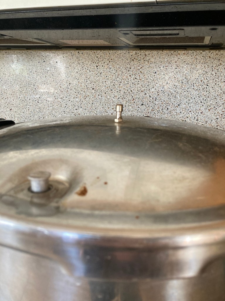 Then you wait for the canner to vent, this is when a steady stream of steam is escaping the vent. It should vent for 10 min before applying a weight or a vent plug if you have a dial canner.
