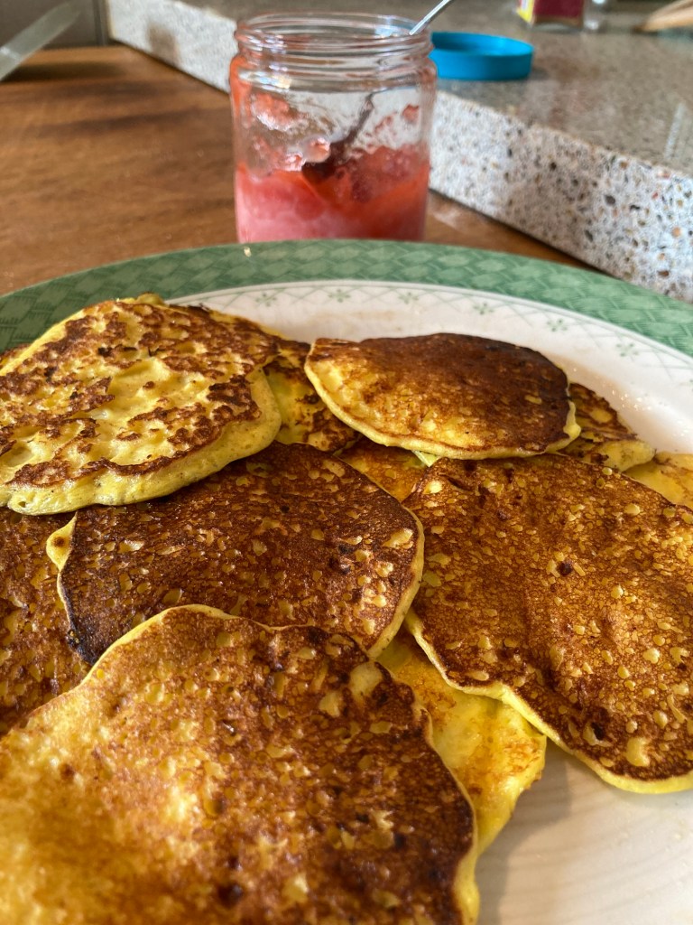 This morning my children insisted on pancakes for breakfast, not an unusual request from them. The only problem being that I haven’t been to the grocery store in over a week as our number one food consumer has been away for military training. So we are out of a lot of our standard ingredients.