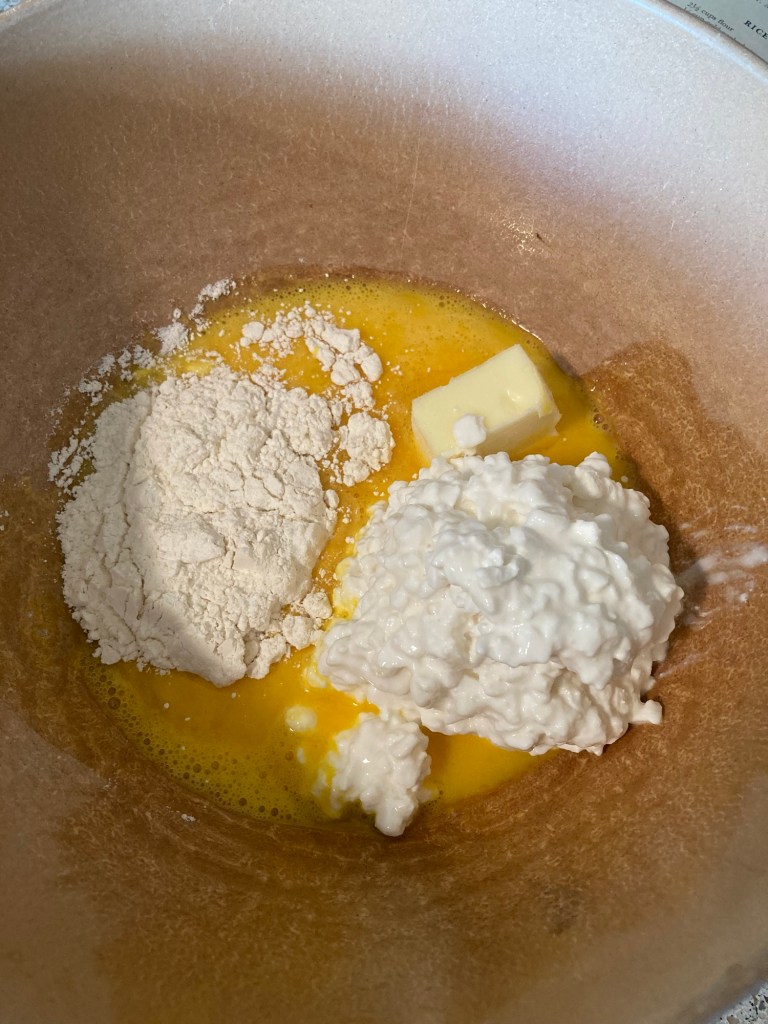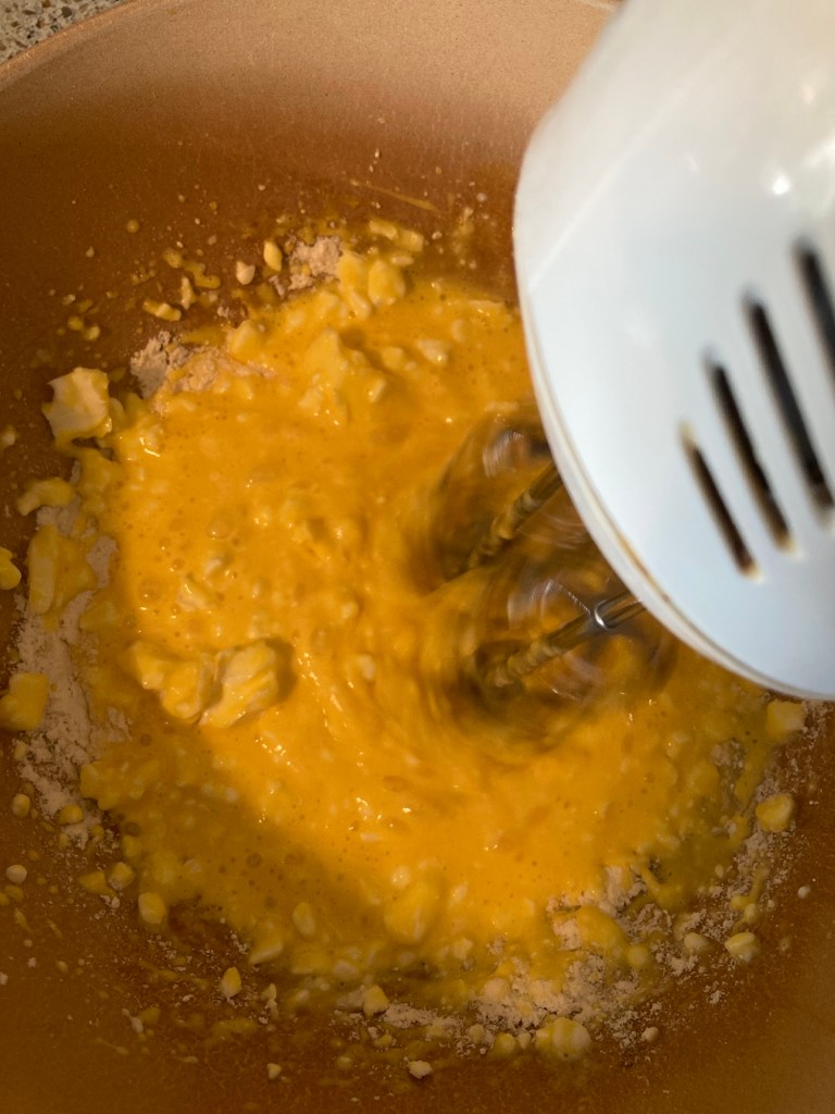 Now beat the living daylights out of it with an electric mixer. I was using large curd cottage cheese so I was trying to have the mixer break up the chunks of cheese, you know to hid them from the kids.