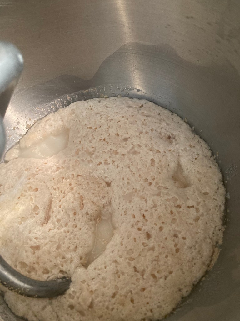 Add milk and water in a bowl, I like to add the sugar/honey now to allow it to dissolve. Now because I am using lard that we rendered and have stored in its solid state I also add this now again to allow it to melt. Let the mixture sit for a bit to cool off. If you add your yeast too early the heat of the scalded milk will kill the yeast. I place my hand on the outside of the bottom of the metal bowl, if I can keep my hand there for 20-30 seconds without thinking it too hot then its ready for the yeast. Mix the yeast into the mixture then let it rest. You will see that the yeast has activated by the foaming (see above photo).