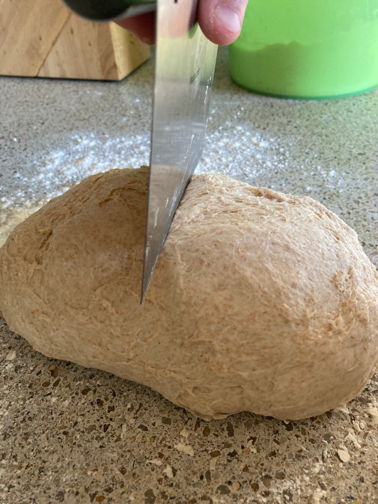 Then simply cut it in half. Shape both haves into rectangles and place them into greased bread pans.