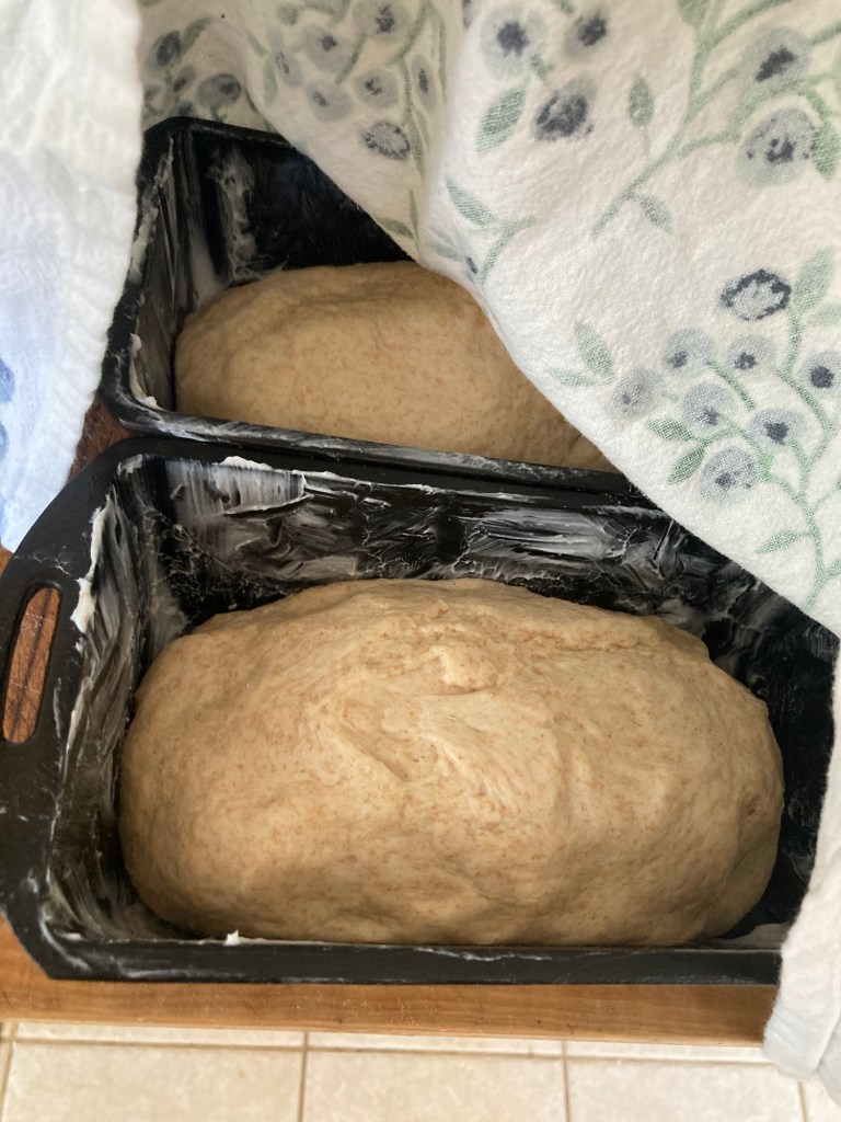 Cover with a towel and let the bread rise again. You want the top of the bread to be just over the edge of the pan when it goes into the oven as it will continue to rise while baking.