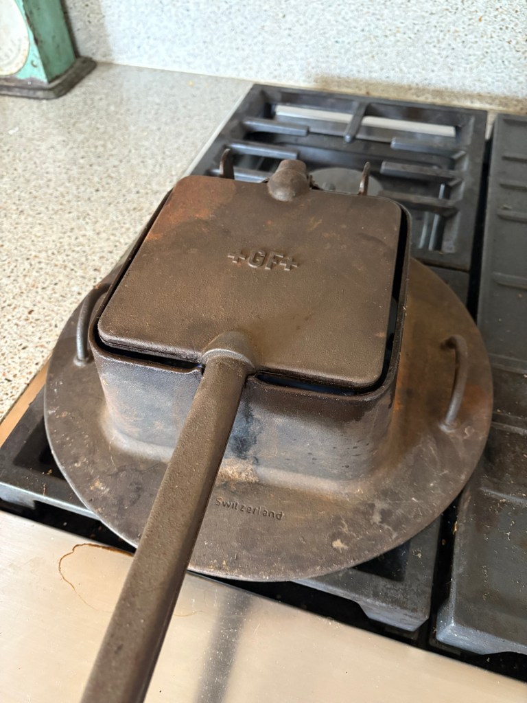 A few weeks ago we attended a semi-local Schwingfest (Traditional Swiss Wrestling Festival), upon returning home I happened upon a cast iron Brätzeli iron on Facebook marketplace. My husband looked at me like I was crazy when I said that I had to have it. We figured out a way to make it happen, as it was located over an hour away in the heart of the worst traffic in the area.
